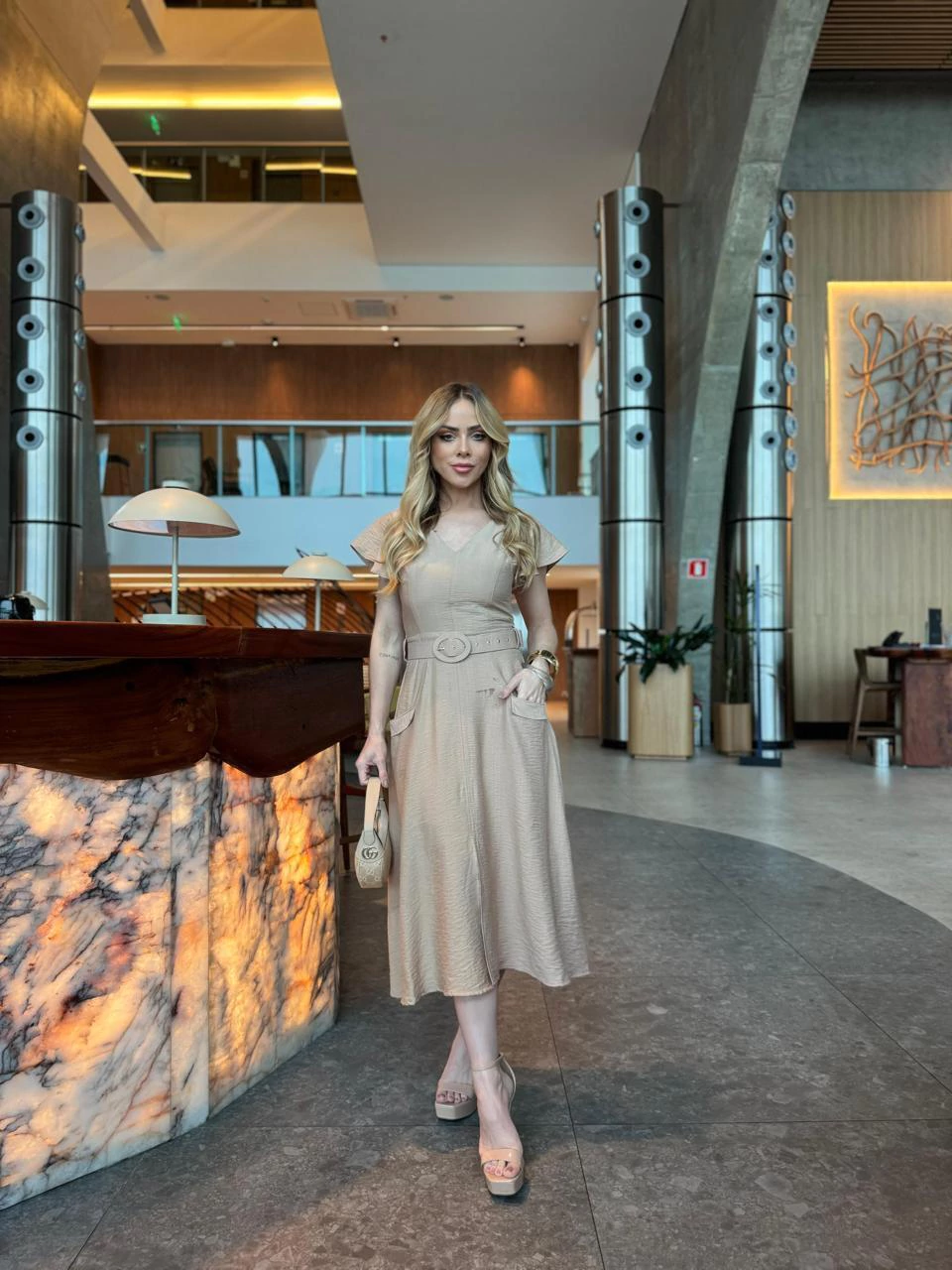 Combine o vestido com acessórios em tons terrosos ou dourados para um look sofisticado. Nos pés, aposte em sandálias de salto ou sapatilhas para produções mais casuais e confortáveis. Para o clima brasileiro, sua modelagem e tecido oferecem leveza sem abrir mão da elegância.