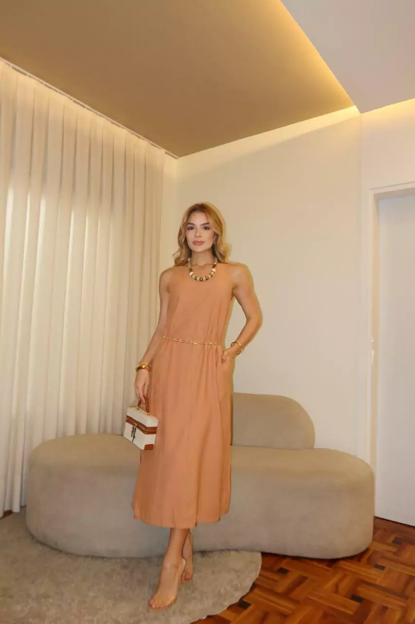 Disponível nas cores bege e caramelo, este vestido é versátil e fácil de combinar, permitindo criar looks desde os mais casuais até os mais elegantes. O detalhe dos bolsos laterais agrega funcionalidade e um charme extra, garantindo praticidade sem abrir mão da estética.